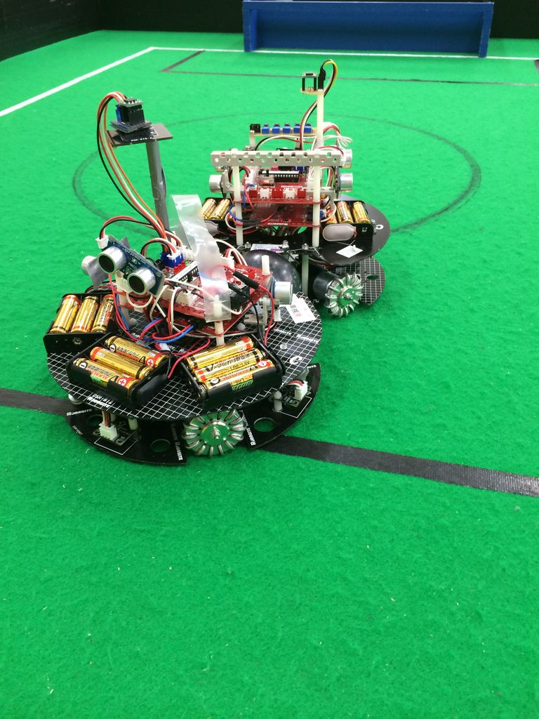 Avanzar y retroceder no es difícil para un robot con ruedas. Arrastrar la pelota hacia adelante parece que tampoco (aunque hay que poder ubicarla y conservarla durante el desplazamiento). ¿Pero cómo puede un carrito patear una pelota? Los robots de esta categoría tienen al frente una placa metálica que se extiende para impulsar la pelota como si se le diera una patada.